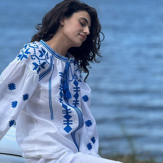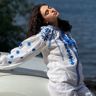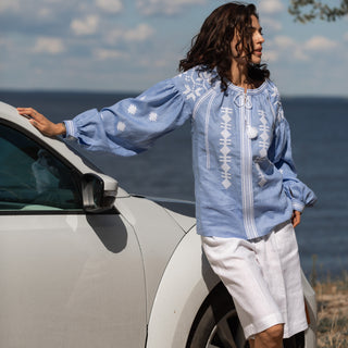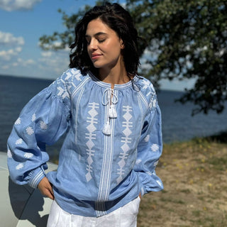 'Grace' Linen Embroidered Vyshyvanka Blouse in Blue