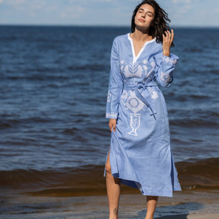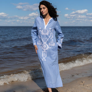 'Dimitra' Linen Embroidered Kaftan Dress Light Blue