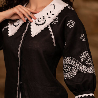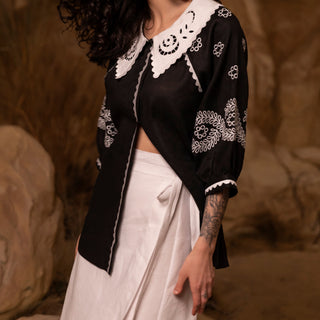 'Veres' Black Linen Embroidered Shirt with Richelieu Collar