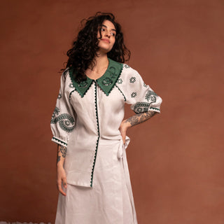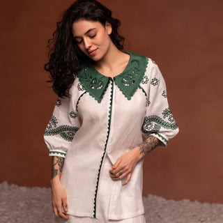 'Veres' Linen Embroidered Shirt with Green Richelieu Collar